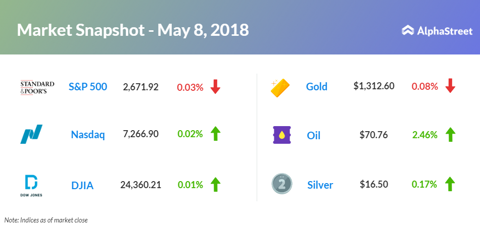 On May 8, US ended mixed, with Dow up 0.012% to 24,360.21 and Nasdaq up 0.023% to 7,266.90. Meanwhile, the S&P 500 closed down 0.027% to 2,671.92. Traders turned mixed following President Donald Trump’s decision to withdraw from Iran’s nuclear deal.