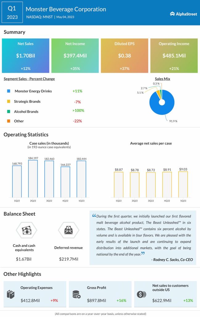 Monster Beverage Corporation (NASDAQ: MNST) reported net sales of $1.85 billion for the second quarter of 2023, which were up 12.1% year-over-year. Net sales on a foreign currency adjusted basis increased 14.4%.