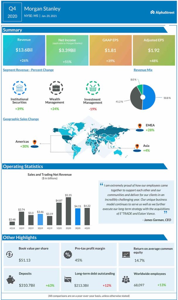 Morgan Stanley (NYSE: MS) reported fourth-quarter 2020 financial results before the markets open on Wednesday.