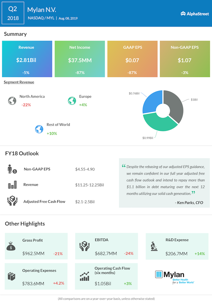 Mylan NV (MYL) missed analyst expectations on revenue and earnings for the second quarter of 2018. The company’s total revenues dropped 5% to $2.81 billion from last year, mainly due to a decline in existing-products sales. The drop in sales from existing products was partially offset by new product launches.