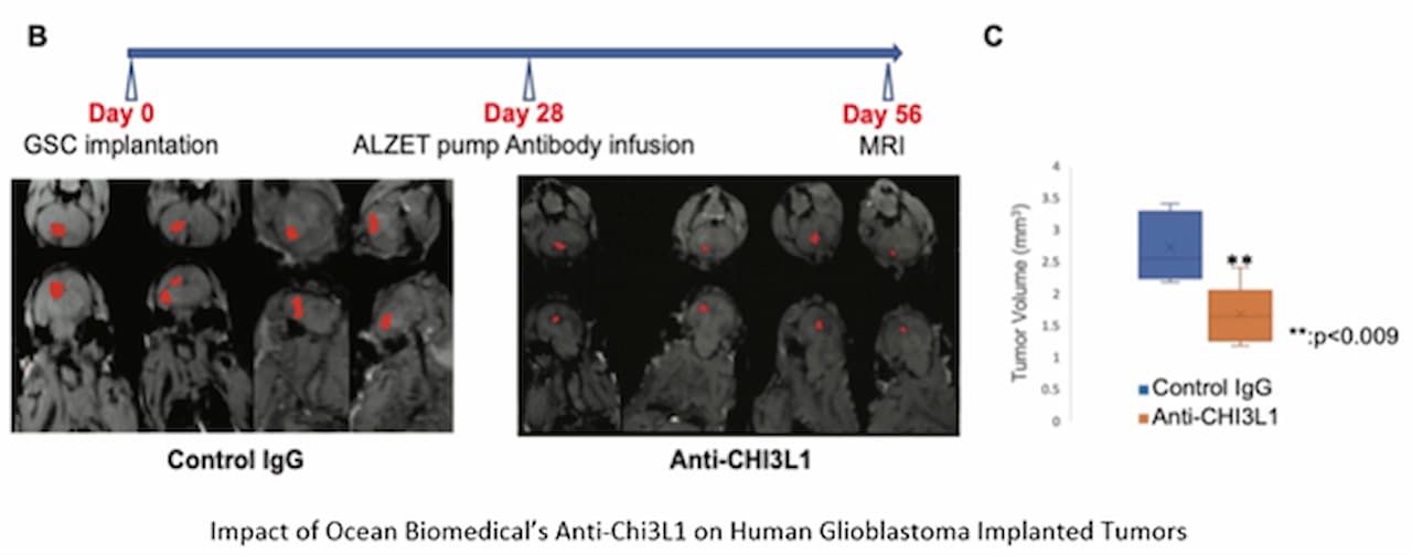The report showed that an independent team led by molecular neuroscientist Dr. Nikos Tapinos uncovered new data on the efficacy of Ocean Biomedical’s anti-Chi3L1 antibody in human glioblastoma implanted mouse models, resulting in a clear reduction in glioblastoma tumor growth. It also gave groundbreaking insights into the mechanisms underlying stem cell differentiation in glioma stem cells, and how that differentiation process is altered by the company’s cancer therapeutic candidate.