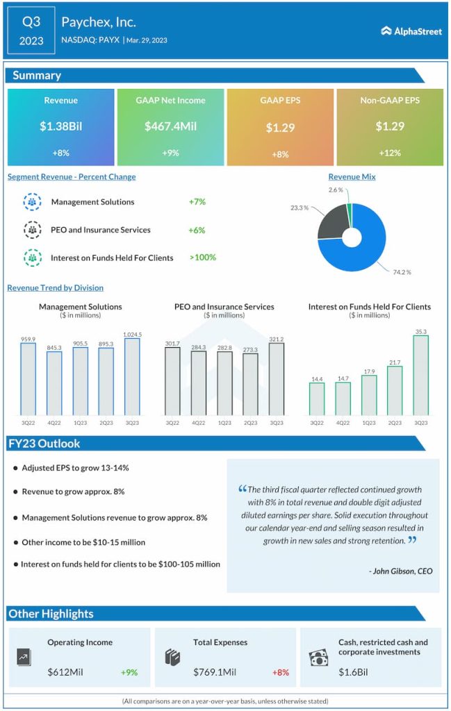 Paychex Inc. (NASDAQ: PAYX) on Thursday said its earnings increased year-over-year in the fourth quarter of 2023, helped by strong revenue growth. The company also provided guidance for fiscal 2024.