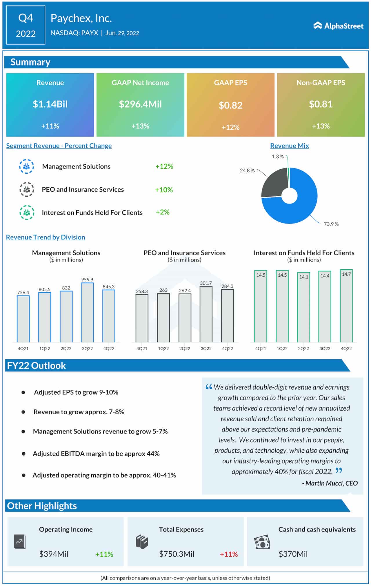 Payroll solutions provider Paychex Inc. (NASDAQ: PAYX) reported higher earnings and revenues for the fourth quarter of 2022. The results also topped Wall Street’s expectations.
