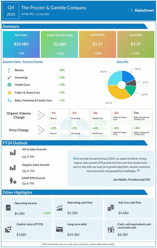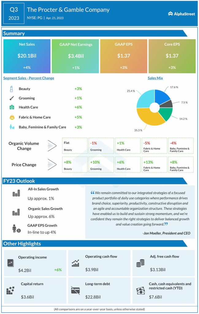 “We delivered solid sales and strong earnings growth in the third quarter despite multiple headwinds, enabling us to raise our EPS growth guidance and maintain our top-line outlook for the fiscal year,” said Jon Moeller, CEO of Procter & Gamble.