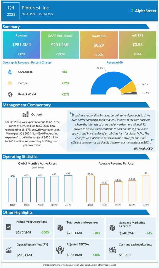 Image search services provider Pinterest, Inc. (NYSE: PINS) has reported a sharp increase in revenues and adjusted earnings for the third quarter of 2024.