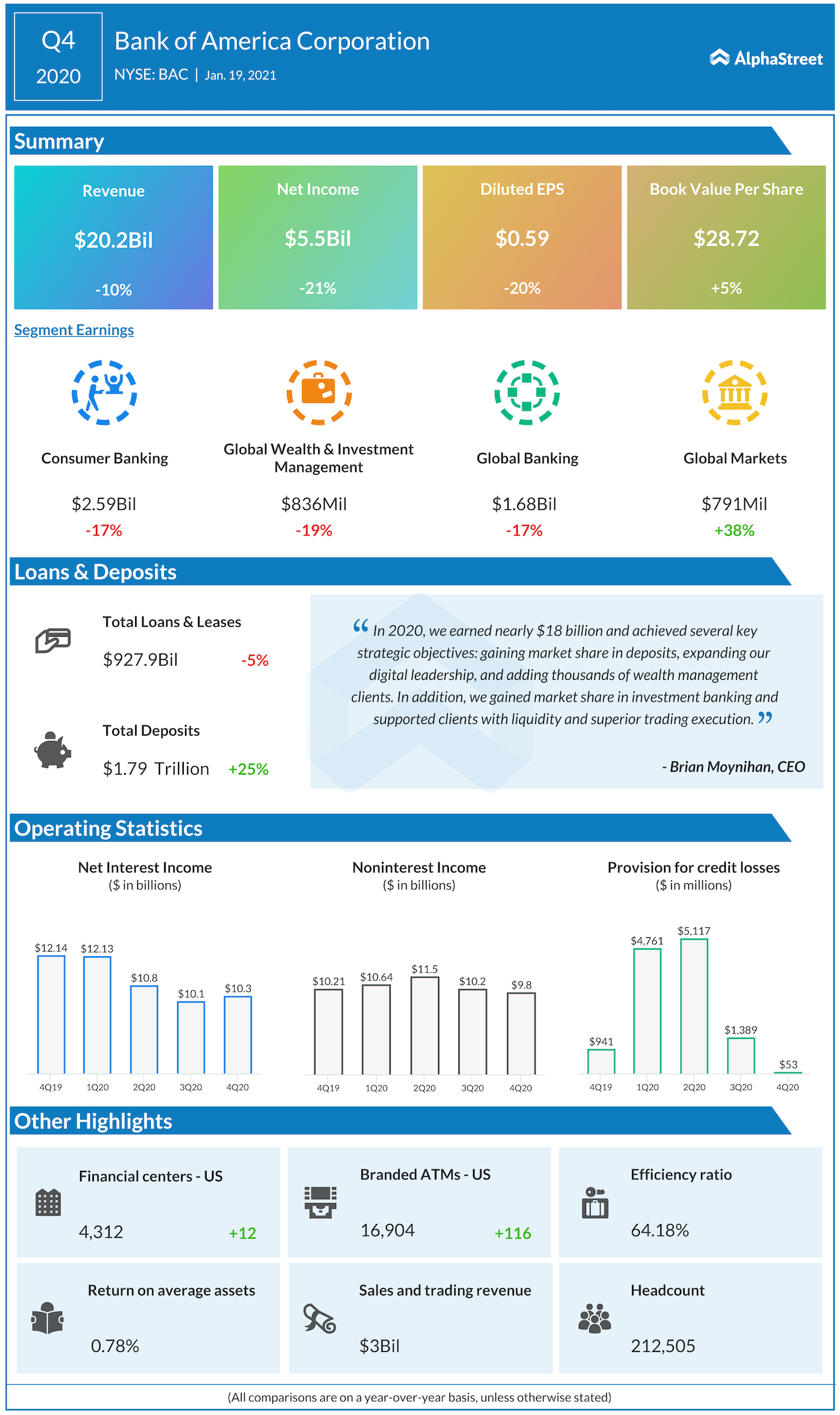 Bank of America (NYSE: BAC) reported fourth-quarter 2020 financial results before the regular market hours on Tuesday. The banking major reported fourth-quarter revenue of $20.2 billion, down 10% year-over-year, and lower than the Wall Street projection. Meanwhile, net income of $0.59 per share was higher than what analysts had anticipated.