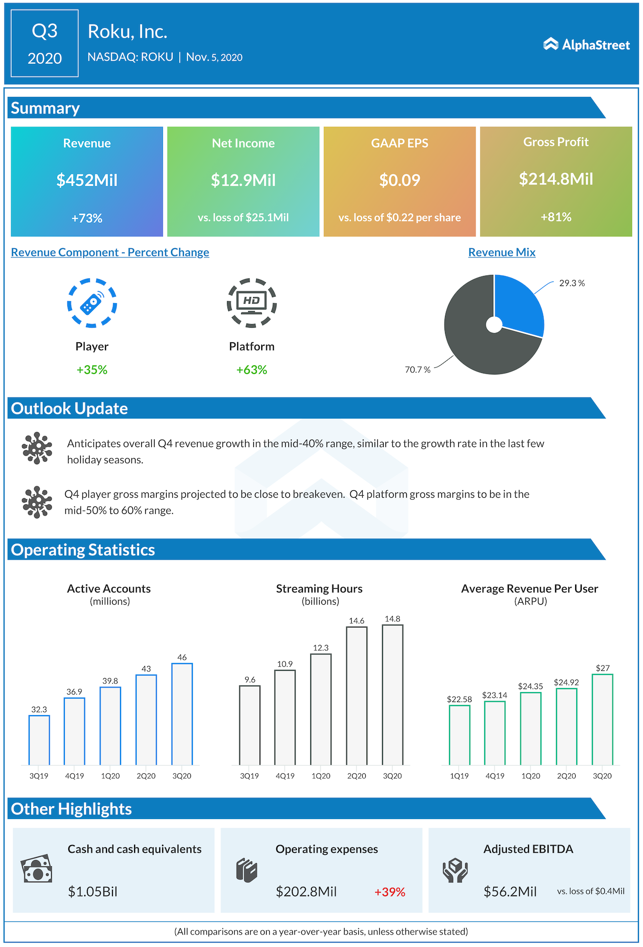 Roku (NASDAQ: ROKU) reported third-quarter 2020 financial results after the regular trading hours on Thursday. The online streaming firm reported a 73% growth in Q3 revenue to $452 million, surpassing the Wall Street consensus. The company reported a net income of $0.09 per share, even as analysts expected a loss.