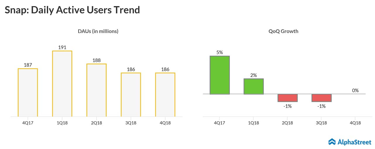 For the last reported quarter, the social camera company reported better-than-expected results. Fourth quarter loss of 4 cents per share and revenue of $390 million surpassed consensus estimated loss of 7 cents per share and revenue of $376.6 million. Daily active users count lowered to 186 million from 187 million in the fourth quarter of 2018 and was flat with third quarter of 2018.
