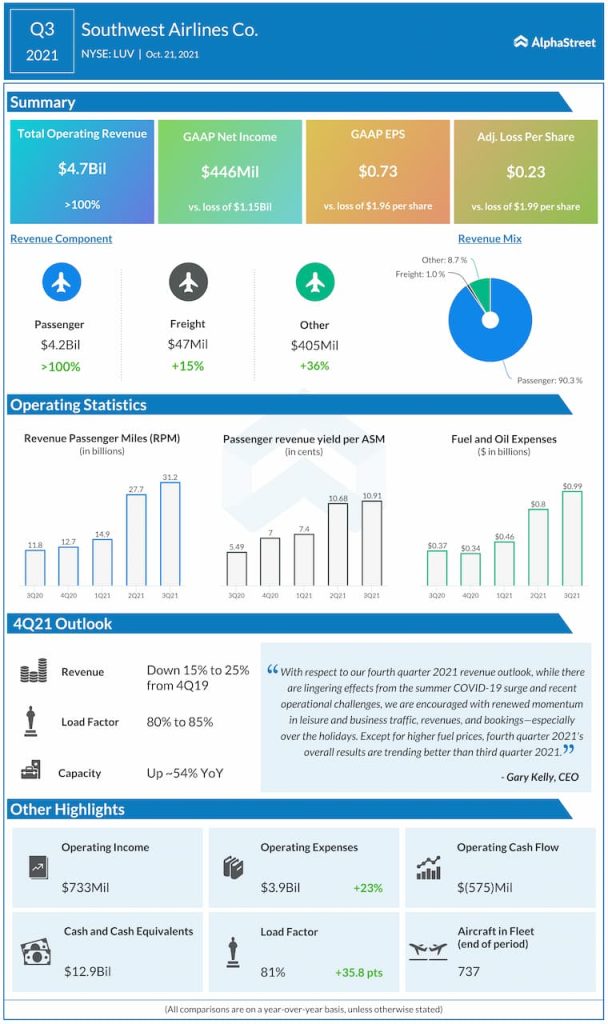 Southwest Airlines (NYSE: LUV) reported fourth-quarter 2021 financial results before the regular market hours on Thursday. The aviation company reported Q4 revenue of $5.1 billion, up over 100% year-over-year and higher than the Wall Street projection. Net income of $0.14 per share was also well above the target that analysts had anticipated.