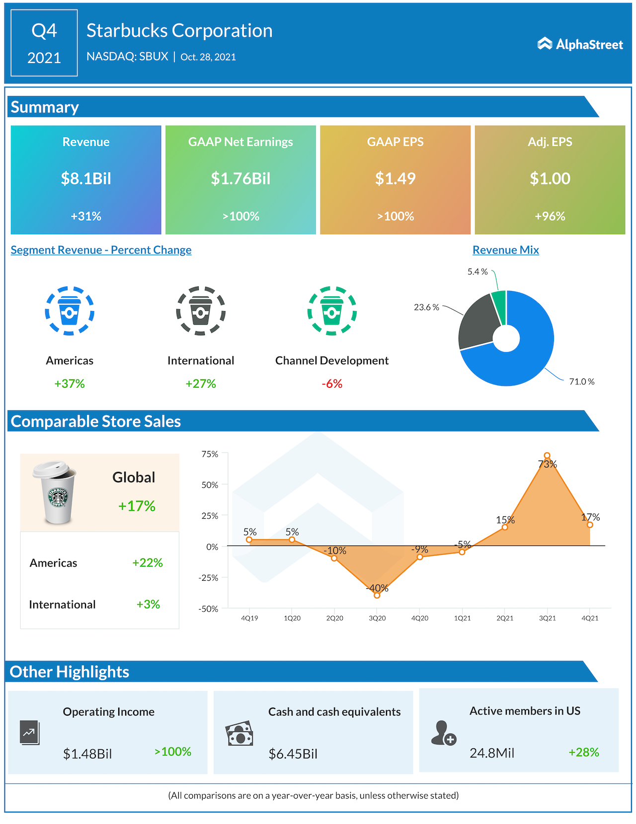 Starbucks Corp (NASDAQ: SBUX) reported fourth-quarter 2021 financial results after the regular market hours on Thursday. The coffee chain reported Q4 revenue of $8.1 billion, up 31% year-over-year, but lower than the Wall Street projection. Net income of $1.00 per share was, meanwhile, a cent above the target that analysts had anticipated.