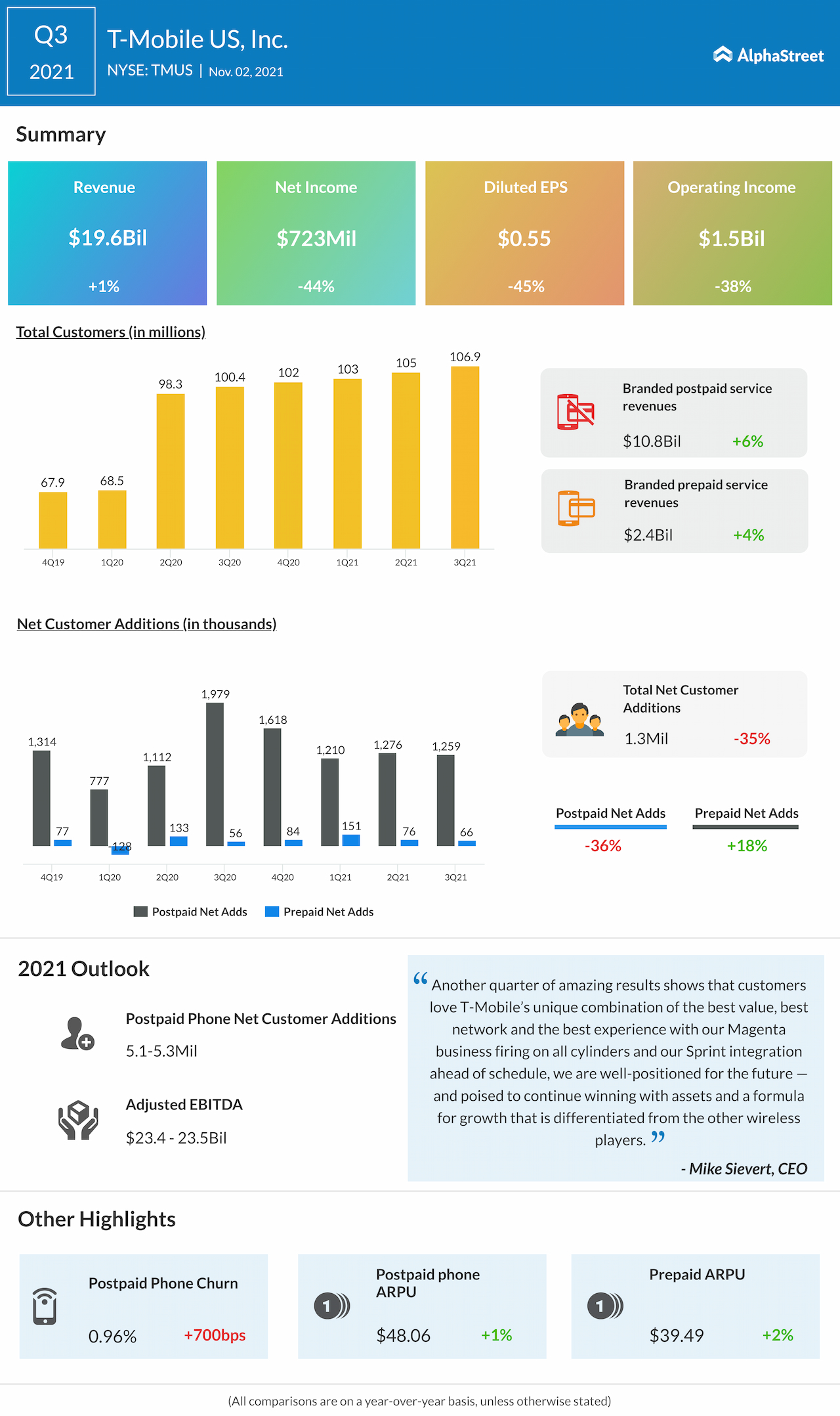 In the third quarter, T-Mobile added around 673,000 new post-paid customers, which is almost in line with the estimates, and reached a total of 107 million customers. Though earnings decreased 45% to $0.55 per share, they topped expectations. Meanwhile, revenues edged up 1% to $19.6 billion, with service revenue reaching a record high of $14.7 billion.