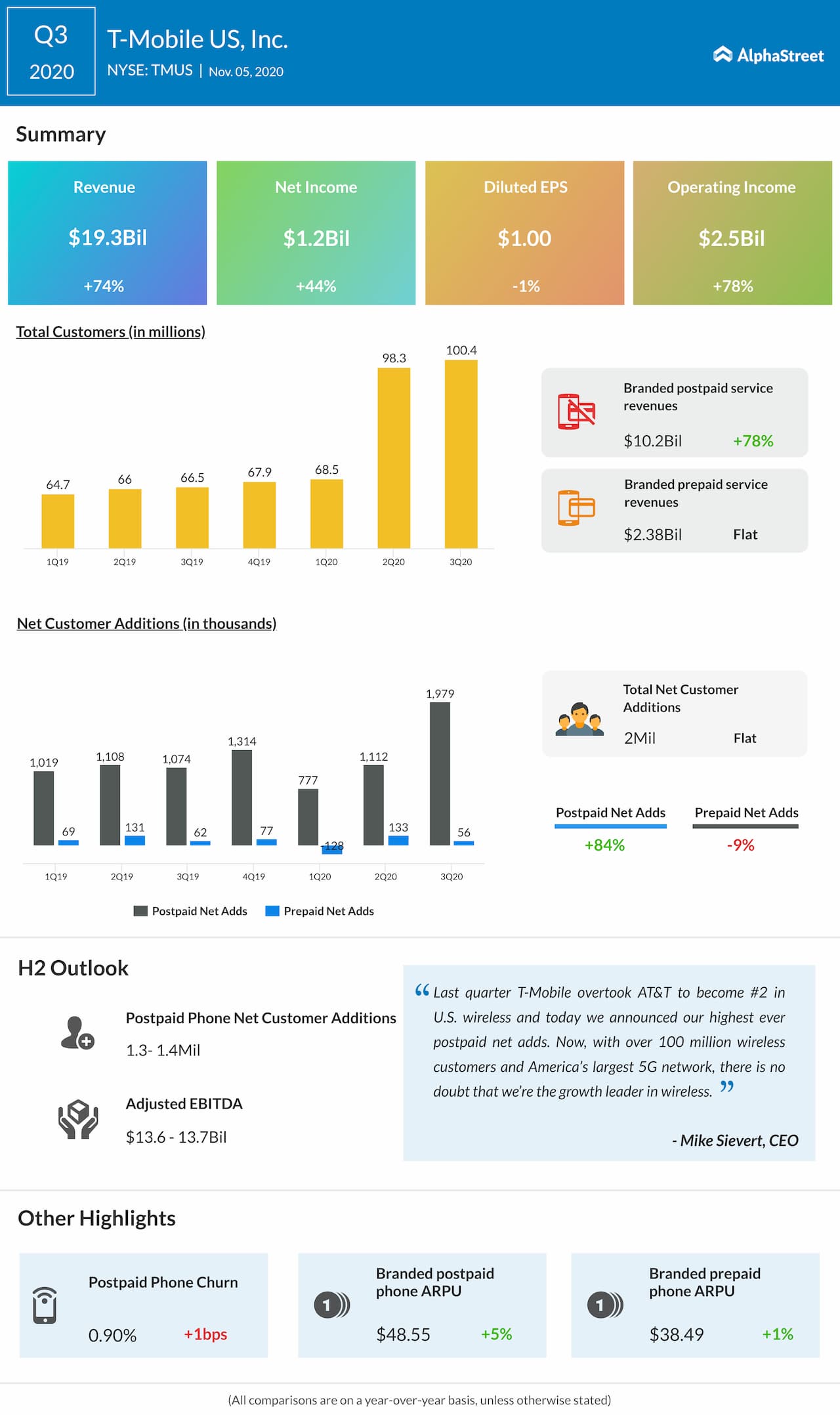 Total revenues increased 74% year-over-year to $19.3 billion, driven by the Sprint merger and customer growth. Total service revenues increased 62% to $14.1 billion.