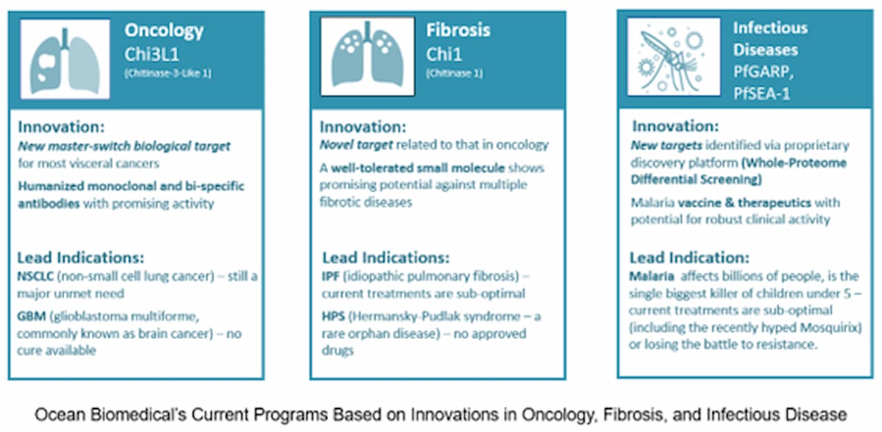 Ocean Biomedical is a healthcare company focused on clinical programs in oncology, fibrosis, infectious disease, and inflammation. The business model involves partnerships with scientists, research universities, and medical centers for developing and commercializing their discoveries.