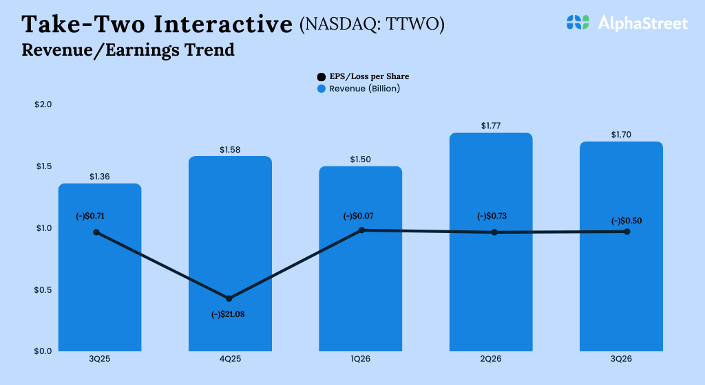 Take-Two Interactive Software, Inc. (NASDAQ: TTWO) reported net revenue of $1.70 billion for the third quarter of 2026 compared to $1.36 billion in the same period last year.