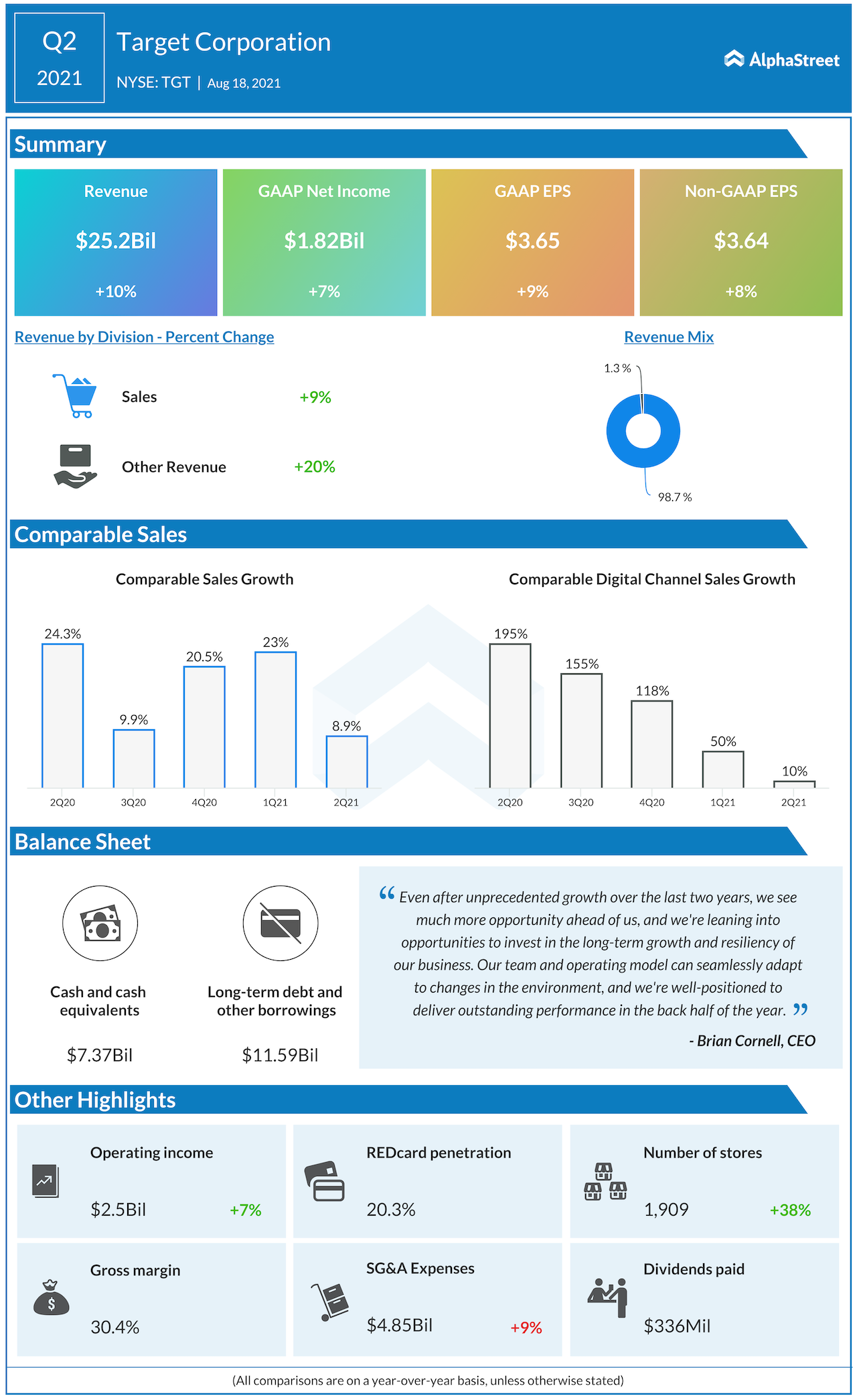 Target Corp (NYSE: TGT) reported second-quarter 2021 financial results before the regular market hours on Wednesday. The department store chain reported Q2 revenue of $25.2 billion, up 10% year-over-year and higher than the Wall Street projection. Net income of $3.64 per share was also above the target that analysts had anticipated.