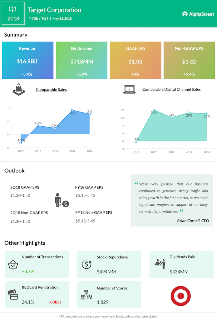 Target Corporation (TGT) posted a 3.4% rise in total revenues to $16.8 billion for the first quarter of 2018 helped by a 3.5% sales growth. Comparable sales grew 3% while comparable digital channel sales jumped 28%.