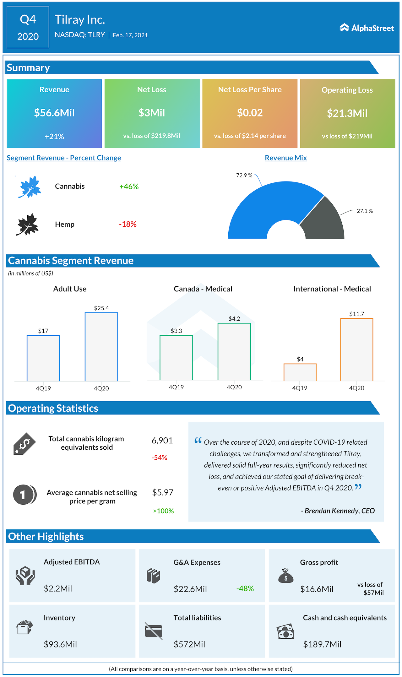 Tilray (NASDAQ: TLRY) reported fourth-quarter 2020 financial results after the regular market hours on Wednesday. The cannabis company reported fourth-quarter revenue of $56.6 million, up 21% year-over-year and above the Wall Street projection. Net loss of $0.02 per share was also narrower than what analysts had anticipated.