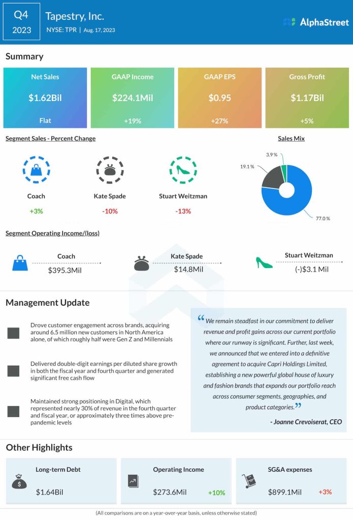 Tapestry Inc. (NYSE: TPR), a leading luxury fashion company, on Thursday reported an increase in adjusted earnings for the first quarter of 2024 when sales remained almost unchanged year-over-year.