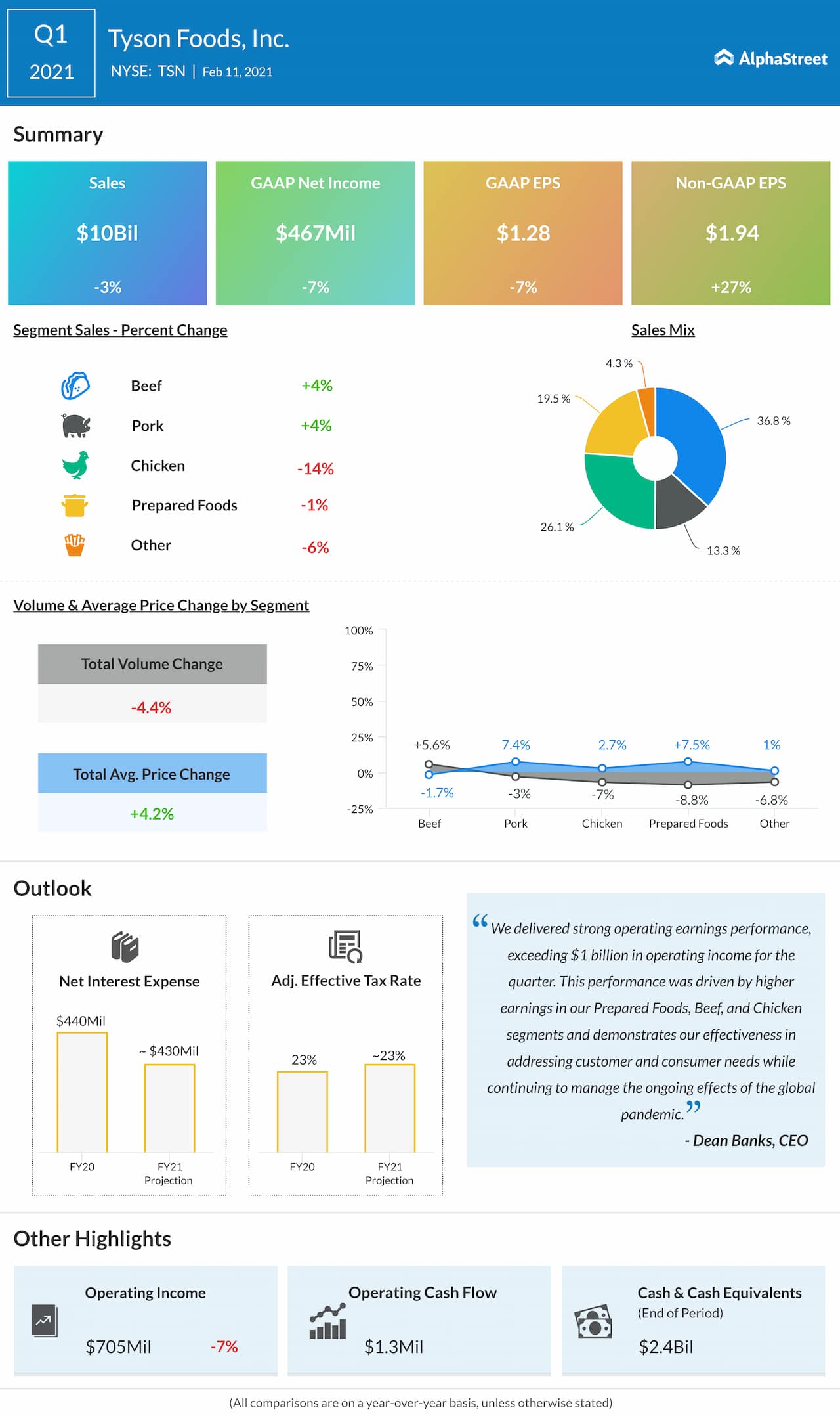 Net income attributable to Tyson was $476 million, or $1.30 per share, compared to $376 million, or $1.03 per share, in the prior-year quarter. Adjusted EPS was $1.34.