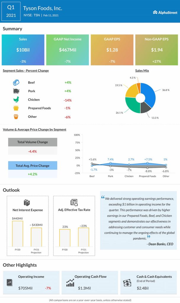 Net income attributable to Tyson was $749 million, or $2.05 per share, compared to $526 million, or $1.44 per share, in the prior-year quarter.