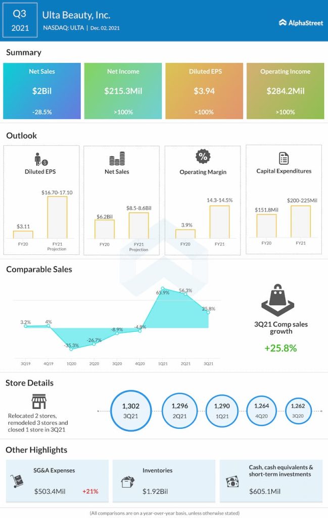 Ulta Beauty, Inc. (NASDAQ: ULTA) reported net sales of $2 billion for the third quarter of 2021. This was up 28.6% from the year-ago quarter thanks to the easing of pandemic-related restrictions. Comparable sales increased 25.8%.