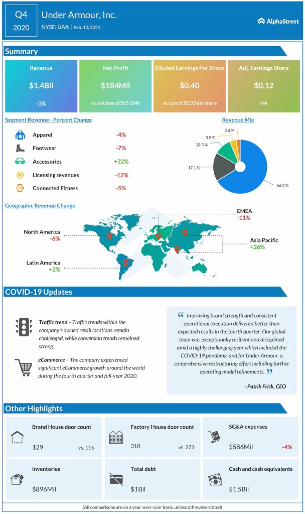 Under Armour, Inc. (NYSE: UAA) today announced its fourth-quarter financial results for the period ended December 31, 2020.
