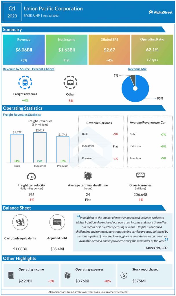 Rail transportation company Union Pacific Corporation (NYSE: UNP) announced financial results for the second quarter of 2023, reporting a decline in revenues.