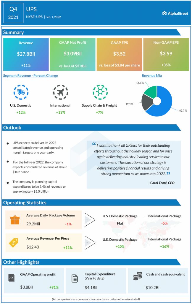 UPS (NYSE: UPS) reported fourth-quarter 2021 financial results before the regular market hours on Tuesday.