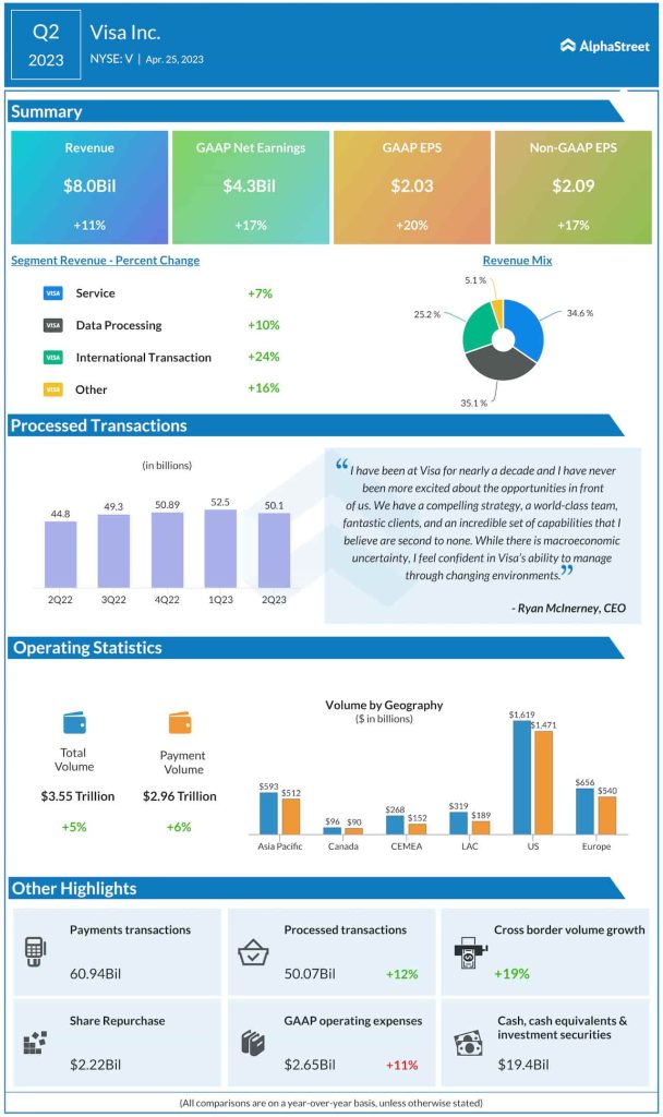 Credit card giant Visa Inc. (NYSE: V) announced results for the fourth quarter of 2023, reporting revenue growth across all operating segments.