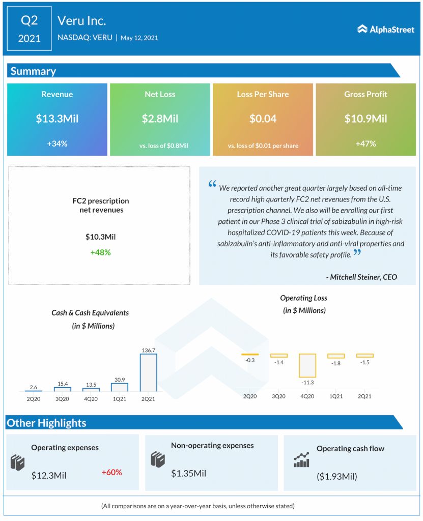 Veru Inc. (NASDAQ: VERU) reported its financial results for the second quarter ended March 31, 2021, on Wednesday before the market opens.