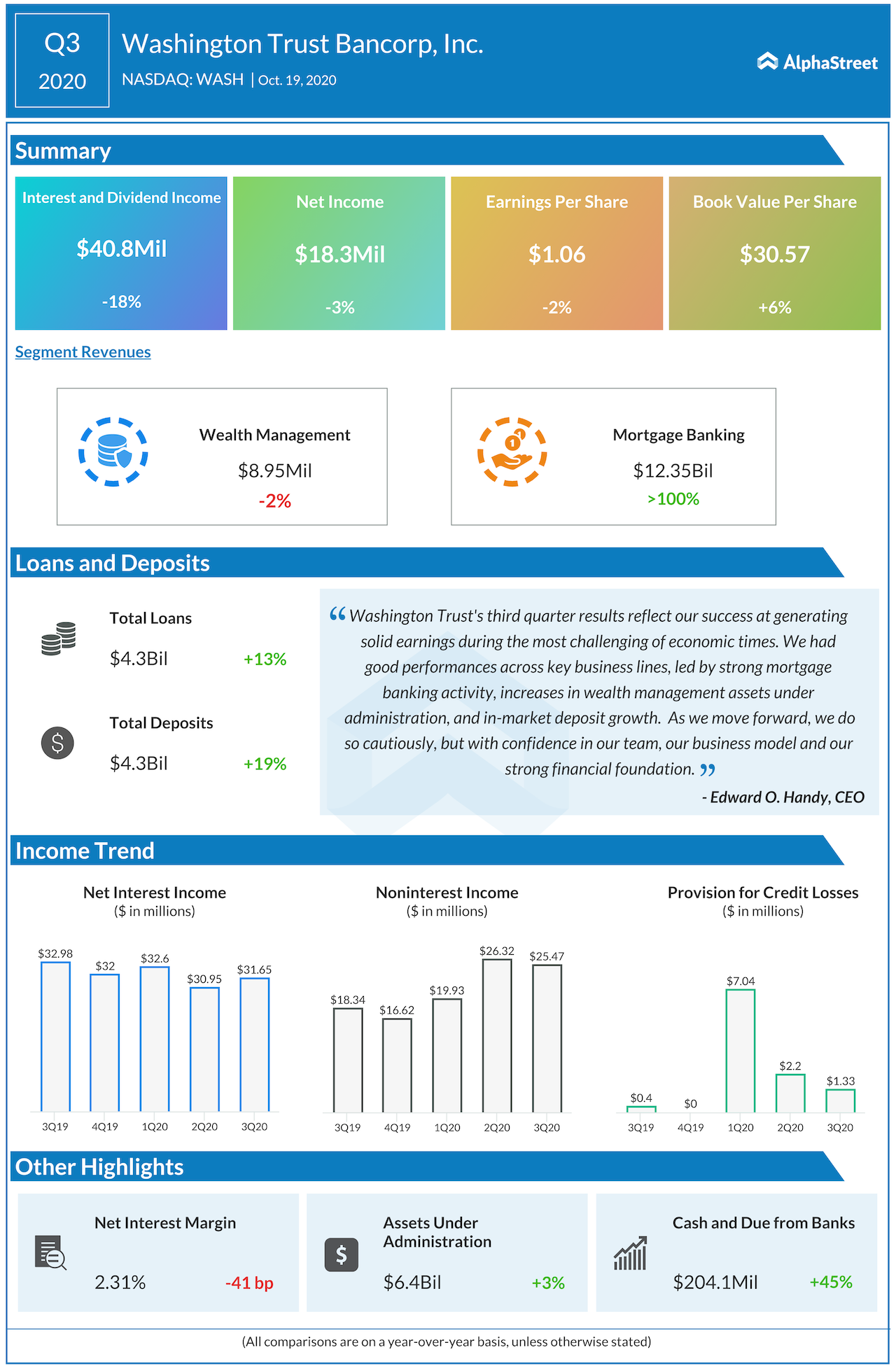 On the heels of relatively strong earnings performance by major banks driven by lower allowance to credit losses and stronger-than-expected trading, Washington Trust Bancorp (NASDAQ: WASH) last week reported Q3 results that surpassed street expectations. In a post-earnings interview with AlphaStreet, executives of the Rhode Island-based community bank responded to five key questions on the fundamental strength of the firm, as well as views on the overall industry.