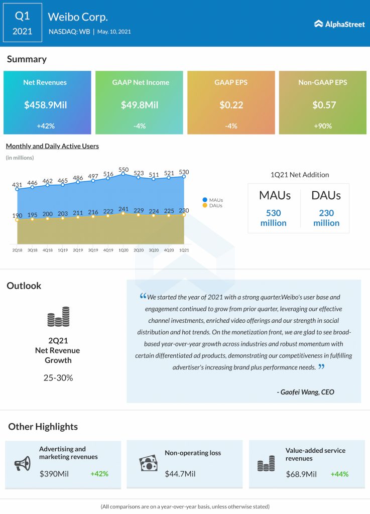 Weibo Corporation (NASDAQ: WB) reported first-quarter 2021 earnings results today.