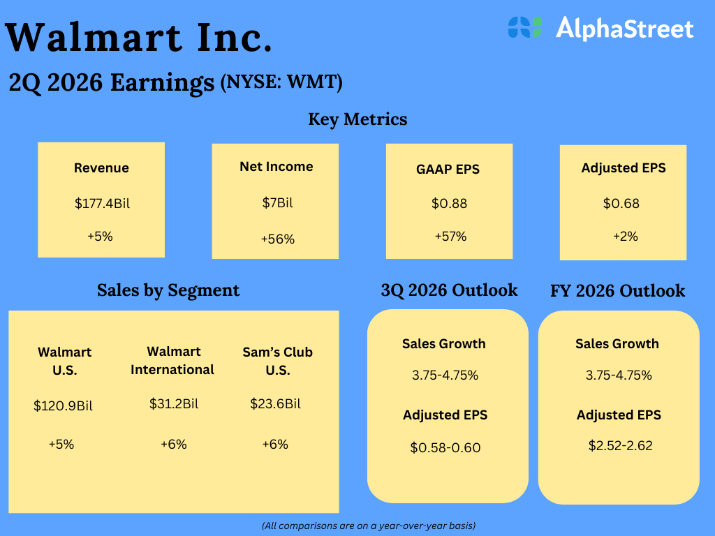 Walmart raised its guidance for fiscal year 2026, and now expects net sales to increase 4.8-5.1% on a constant currency basis. Adjusted EPS is now expected to be $2.58-2.63.