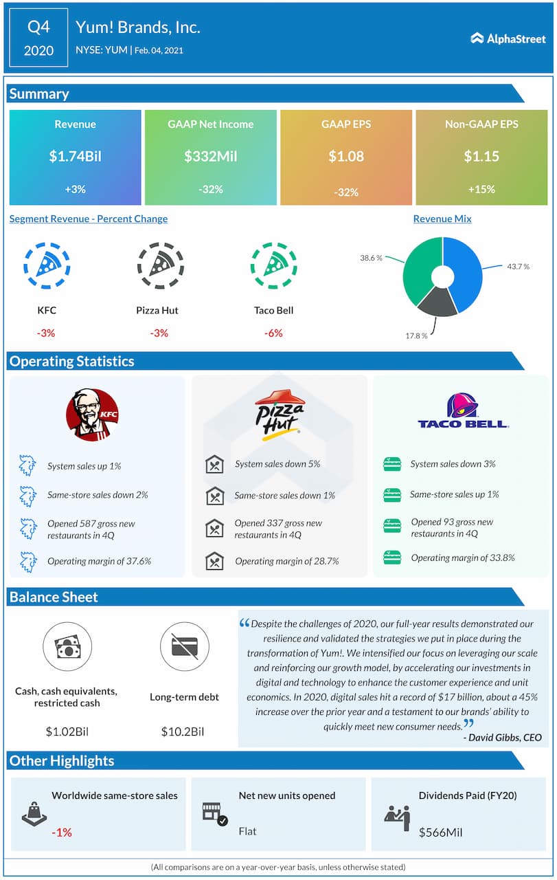 Yum! Brands, Inc. (NYSE: YUM) reported first quarter 2021 earnings results today.